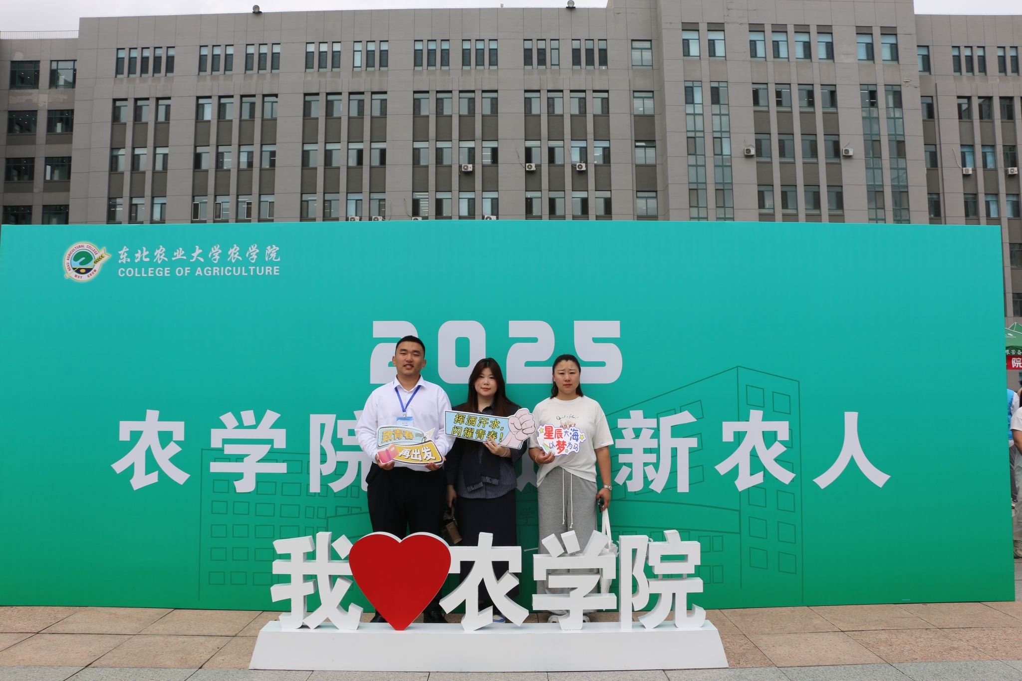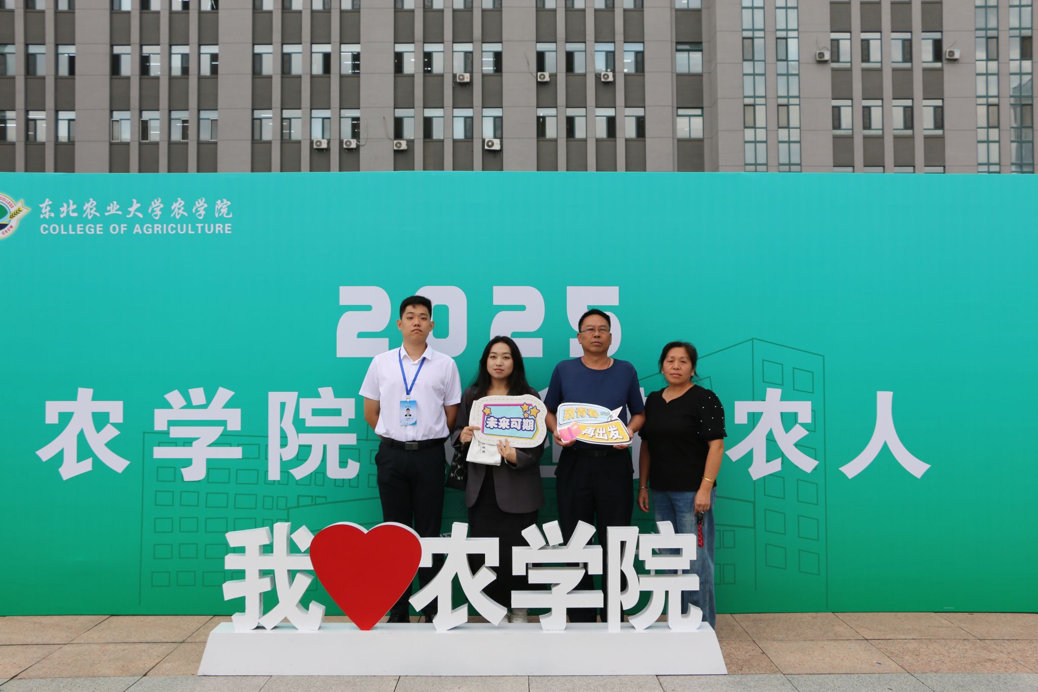在展板前学生与父母和辅导员老师合影,入学的喜悦与对未来的期待都被锁进这意义十足的照片里。