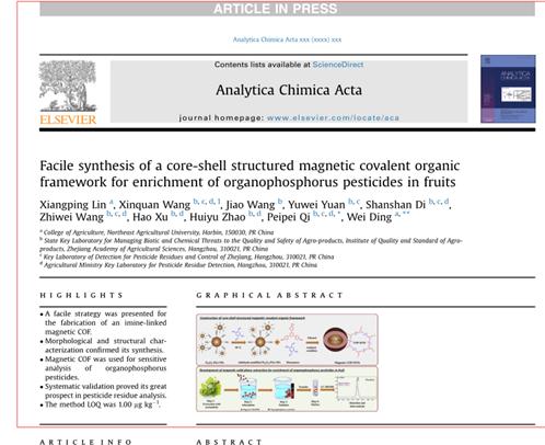 近期,国际学术期刊《Analytica Chimica Acta》,1区,IF=5.256在线发表了bevictor伟德国际1946杂草综合治理团队与浙江省农业科学院合作的题为“Facile synthesis of a core-shell structured magnetic covalentorganic framework for enrichment of organophosphorus pesticides in fruits”的研究论文。