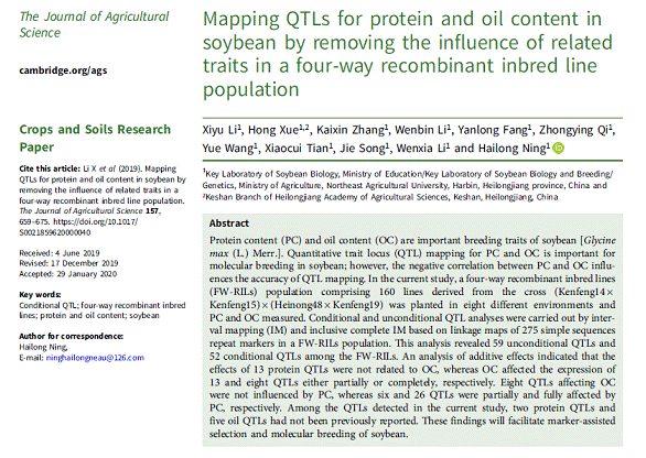 宁海龙教授研究团队以(垦丰14×垦丰15)×(黑农48×垦丰19)衍生的大豆四向杂交设计重组自交系群体作为材料,应用SSR标记对个体进行分型,使用连锁分析对蛋白质与油份含量进行QTL定位。连锁分析共检测到48个QTL,多方法及多环境定位到34蛋白质含量QTL和40个油份含量QTL。该研究结果对于进一步揭示大豆蛋白质与油份含量的分子机制、改良蛋白质与油份含量、精细定位蛋白质与油份含量QTL与候选基因的挖掘具有重要意义。