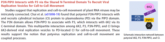 植物病毒是一类细胞内专性寄主的病原物,它们几乎完全依赖植物进行基因组复制、蛋白表达、细胞间运动。马铃薯Y病毒属病毒占目前已知植物病毒30%以上,包括许多危害性病毒种类。P3N-PIPO是马铃薯Y病毒属(Potyvirus)病毒编码的运动蛋白,前人研究表明P3N-PIPO通过引导CI从细胞质运动至胞间连丝形成锥状结构来参与细胞间运动。本文以芜菁花叶病毒(Turnip mosaic virus,TuMV)作为模式病毒对P3N-PIPO的功能进行研究,发现P3N-PIPO与P3通过共有的P3N结构域互作,敲除P3N-PIPO或P3的P3N结构域都导致TuMV细胞间运动能力的丧失,P3N-PIPO通过PIPO结构域引导CI至胞间连丝,通过P3N结构域定位于6K2复制泡或聚集体。以上结果表明,P3N-PIPO通过P3N和P3互作来参与马铃薯Y病毒属病毒的细胞间运动。本研究结果不仅进一步揭示了P3N-PIPO的功能,而且揭示了P3通过与P3N-PIPO互作来参与细胞间运动的新功能,因而加深了对马铃薯Y病毒属病毒衔接复制和细胞间运动的认识。该论文被Journal of Virology编辑选为当期热点文章(Spotlight),并在评论中认为该结果直接说明马铃薯Y病毒属病毒的复制和细胞间运动是耦合的。