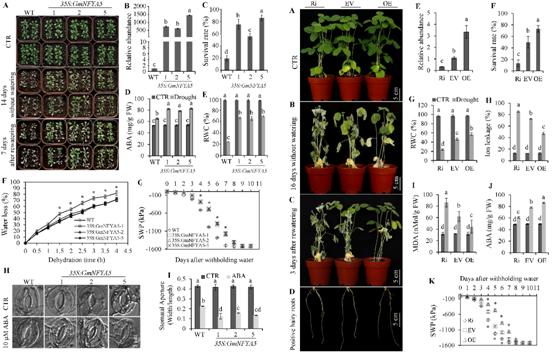 作物产量受非生物胁迫影响,其中干旱是最为普遍的。NF-Y基因,尤其是NF-YA基因,能够调控植物对非生物胁迫的抗性。GmNFYA5是大豆21个NF-YA基因中干旱胁迫下表达量最高的基因。ABA合成抑制剂萘普生能够降低干旱诱导的GmNFYA5的表达量。通过减小气孔开度和降低失水率,GmNFYA5过表达拟南芥的耐旱性较野生型增强。与空载体转基因大豆相比,GmNFYA5过表达和干扰大豆植株的耐旱性分别是增强和降低的。ABA相关基因(ABI2、ABI3、NCED3、LEA3、RD29A、P5CS1、GmWRKY46、GmNCED2和GmbZIP1)和ABA不相关基因(DREB1A、DREB2A、DREB2B、GmDREB1、GmDREB2和GmDREB3)在过表达株系中的表达量较野生型植物显著性提高,而在大豆干扰株系中这些基因的表达量是降低的。体内LUC试验证明GmNFYA5可能通过结合GmDREB2和GmbZIP1的启动子进而直接调控这两个基因。我们的结果显示过表达GmNFYA5提高大豆耐旱性是通过ABA依赖和ABA非依赖途径。