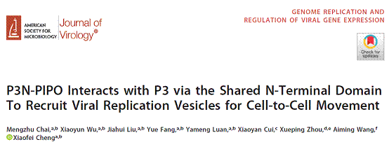 2019年4月1日,病毒学Top期刊《Journal ofVirology》在线发表了bevictor伟德国际1946分子植物病毒学研究团队程晓非教授团队的题为“P3N-PIPO Interacts with P3 via the Shared N-Terminal Domain ToRecruit ViralReplication Vesicles for Cell-to-Cell Movement”的研究论文。