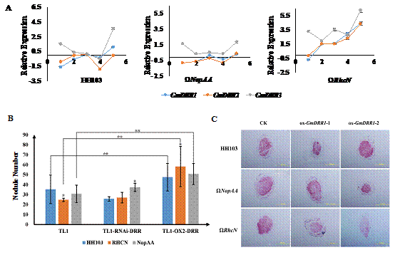 根瘤菌Ⅲ型效应因子是调控大豆共生结瘤的关键信号因子,根瘤菌Ⅲ型效应因子NopD互作候选基因的确定,为大豆共生结瘤性状的改良奠定了重要理论基础。Ⅲ型效应因子NopAA与GmDRR1的互作关系为深入揭示共生结瘤分子机制提供了重要线索。陈庆山教授和辛大伟教授在大豆共生结瘤领域,通过多年的努力,获得多个根瘤菌突变体和大豆共生结瘤特殊材料。