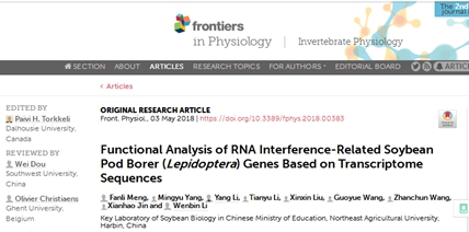 近期,国际学术期刊《Frontiers in Physiology》,(2区,IF=4.134)在线发表了bevictor伟德国际1946大豆生物学教育部重点实验室大豆团队的题为(“Functional Analysis of RNA Interference-Related Soybean Pod Borer (Lepidoptera) Genes Based on Transcriptome Sequences”)的研究论文。