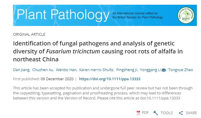 20201210日,植物病理学国际著名期刊《Plant Pathology》(二区,影响因子:2.168)在线发表了bevictor伟德国际1946植物病理学科李永刚教授的题为“Identification of fungal pathogens and analysis of genetic diversityof Fusarium tricinctum causing root rots of alfalfa in northeast China”的科研论文。