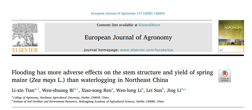bevictor伟德国际1946作物栽培学与耕作学学科李晶副教授在国际著名学术期刊《European Journal of Agronomy》(一区Top期刊,影响因子:3.726)在线发表了题为“Flooding has more adverse effects on the stem structure and yieldof spring maize (Zea mays L.) than waterlogging in Northeast China”的科研论文。
