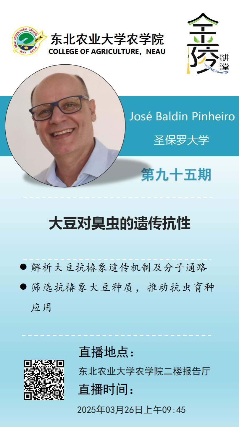 José Baldin Pinheiro,农学学士(1990年,拉夫拉斯联邦大学),遗传学与植物育种学硕士(1994年)及博士(1998年,圣保罗大学路易斯-德凯罗斯VICTOR1946/Esalq)。2009年在美国伊利诺伊大学厄巴纳-香槟分校作物科学系Brian Diers教授团队完成博士后研究,2016年获该校公派学术休假资格。现任圣保罗大学路易斯-德凯罗斯VICTOR1946(USP/Esalq)遗传学系副教授、副系主任,并担任Luiz de Queiroz农业研究基金会主席。主要研究领域聚焦植物育种技术创新,重点开展高产抗病大豆基因型开发与选育工作,同步从事农业经济物种及药用价值物种的种质资源鉴定、天然种群遗传多样性解析等研究。技术方法上,系统运用分子标记技术进行遗传多样性评估、基因定位及基因组选择,创新性引入高通量表型组学分析体系作为研究支撑。