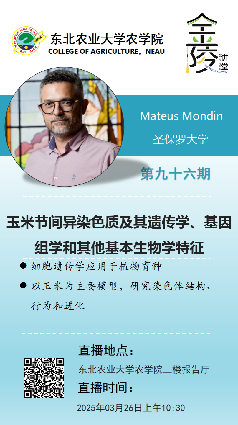 Mateus Mondin,农学学士(1998年,圣保罗大学路易斯-德凯罗斯VICTOR1946/USP),遗传学与植物育种学博士(2003年,同校)。2010至2011年任英国莱斯特大学荣誉客座研究员,2017至2018年任美国科罗拉多州立大学高级访问学者。历任ESALQTec创业孵化器首席执行官、皮拉西卡巴河谷农业科技谷创始人,并担任巴西教育部(MEC)农业生物技术指导计划特聘导师。现任圣保罗大学路易斯-德凯罗斯VICTOR1946(Esalq/USP)遗传学系助理教授,领衔细胞基因组学与表观遗传学实验室(CYNGELA)建设,专精植物细胞遗传学育种技术体系构建。研究聚焦染色体结构解析、动态行为观测及进化机制研究,建立以玉米为核心的模式生物研究平台。