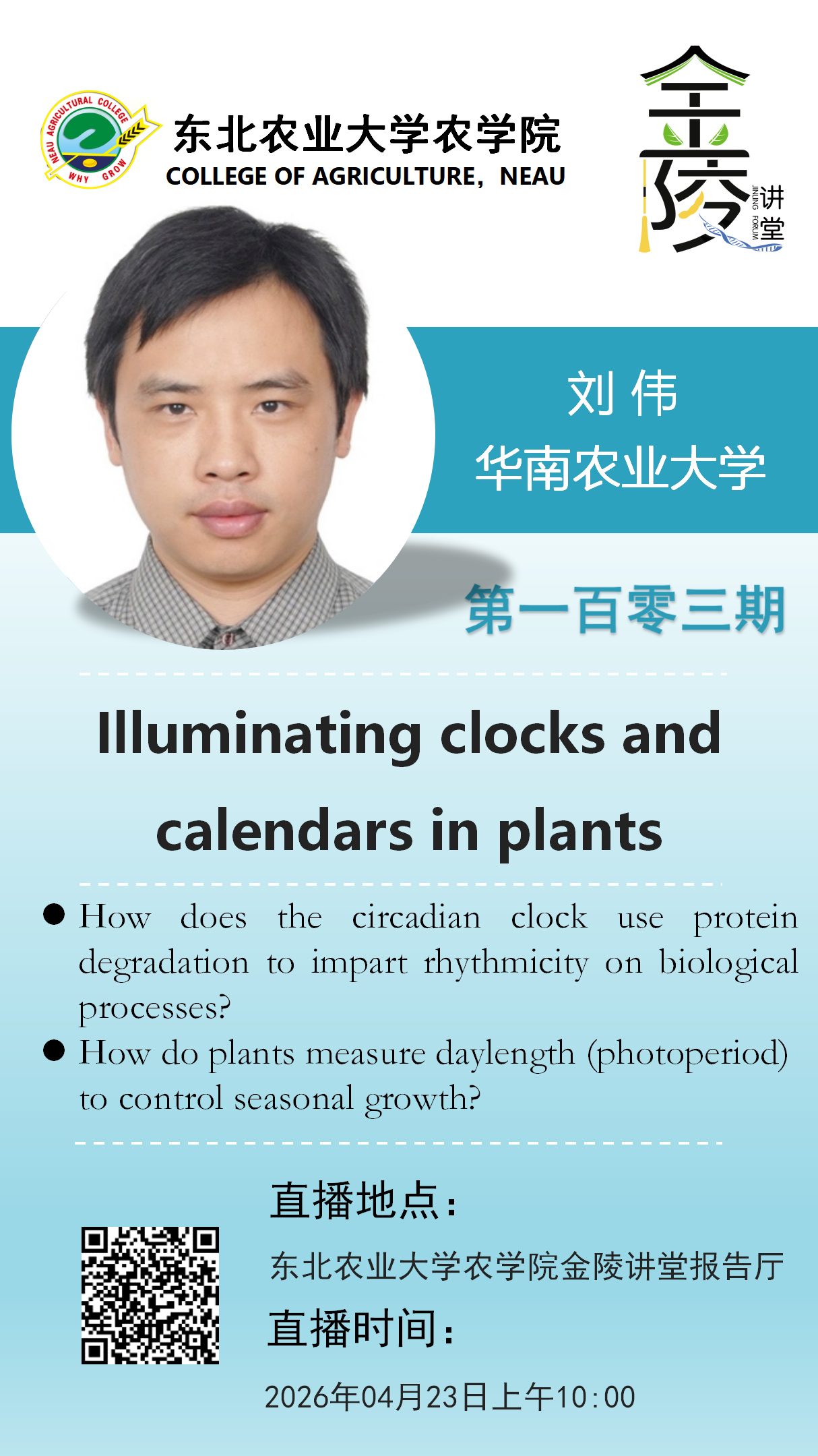 刘伟,生物化学与分子生物学专业,博士,华南农业大学教授,博士生导师,入选广东省珠江人才计划。博士毕业于中山大学,2015至2024年在美国耶鲁大学先后从事博士后和副研究员工作。研究关注光周期调控植物环境适应性的分子机制,首次揭示了植物可以通过两种光周期测量系统分别调控植物开花时间和生长速度,相关成果发表于Science、Developmental Cell、PNAS、Mol Plant等杂志20余篇。多次受邀在美国植物生物学家学会(ASPB)、戈登峰会(GRC)等国际会议上做学术报告。