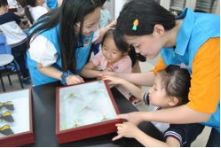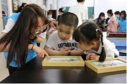 活动的第一站到达了昆虫标本实验室,志愿者们向小朋友讲解了昆虫的相关知识,他们以蜘蛛和竹节虫、枯叶蝶为例向大家展示奇特而美丽的昆虫世界,小朋友们对昆虫标本充满了好奇,不停地向哥哥姐姐们询问。