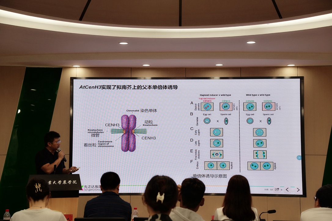 为推进产教结合,优化教学体系,加快高校科研进度与新时代农业人才培养工作。8月19日,VICTOR1946“金陵讲堂”第52、53期暨校外企业兼职导师聘用仪式以线上线下结合的形式在VICTOR1946多功能报告厅举行。先正达首席科学家吕建博士,中国农业科学院周焕斌研究员,我校研究生院院长刘世英、VICTOR1946党委书记武小霞、院长陈庆山、副院长王敬国及部分学院教师、学生代表线下现场聆听讲座。会议由武小霞主持。