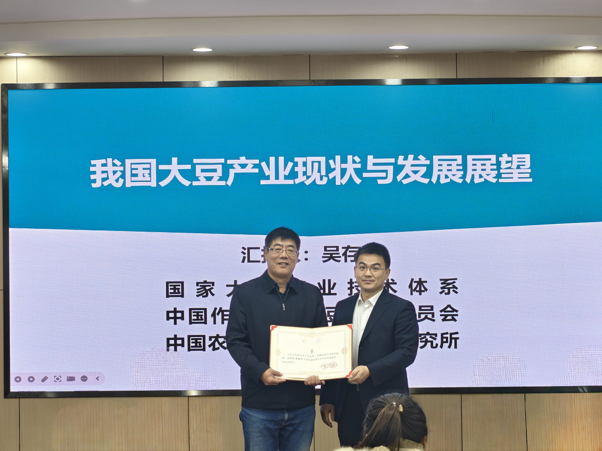 国家大豆产业技术体系首席科学家吴存祥研究员在开班式上致辞。大豆产业是一个综合性的产业,涉及品种选育、栽培技术、病虫害防治、产后加工等多个环节。要加强与同行之间的交流与合作,取长补短,共同攻克大豆产业发展中的难题。开班式后,吴存祥为大豆学校讲授第一课。