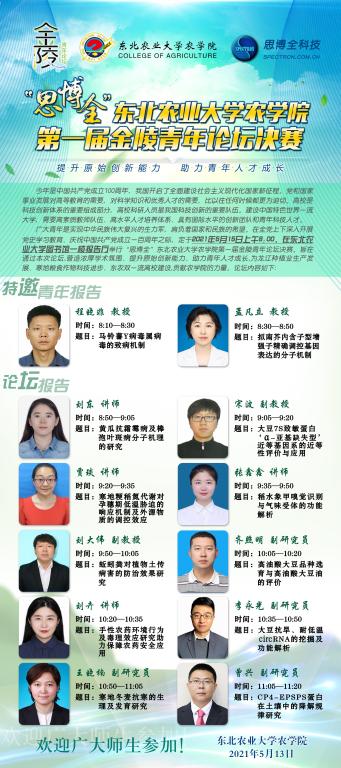 广大青年是实现中华民族伟大复兴的生力军,肩负着国家和民族的希望。在全党上下深入开展党史学习教育、庆祝中国共产党成立一百周年之际,定于2021年5月15日上午8:00,在bevictor伟德国际1946图书馆一楼报告厅召开“思博全”伟德国际VICTOR1946第一届金陵青年论坛决赛。旨在通过本次论坛,营造浓厚学术氛围、提升原始创新能力、助力青年人才成长,为龙江种植业生产发展、寒地粮食作物科技进步、东农双一流高校建设,贡献VICTOR1946的力量。论坛海报如下: